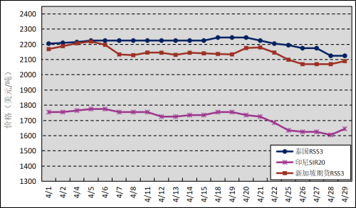 國外主產(chǎn)區(qū):4月,泰國RSS3平均價格為2210美元/噸,環(huán)比上漲67美元/噸,最高價為2245美元/噸,最低價為2125美元/噸;印尼SIR20平均價格為1718美元/噸,環(huán)比下跌15美元/噸,最高價為1775美元/噸,最低價為1605美元/噸;新加坡RSS3期貨主力合約月均結(jié)算價格為2142美元/噸,環(huán)比下跌25美元/噸,最高價為2219美元/噸,最低價為2070美元/噸。