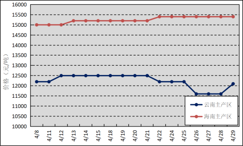國內(nèi)主產(chǎn)區(qū):4月,我國天然橡膠主產(chǎn)區(qū)進入開割季。其中,云南產(chǎn)區(qū)已全面開割;海南產(chǎn)區(qū)氣候異常,橡膠樹落葉不均勻,白粉病重度危害,月底開割面積不到一半。海南和云南原料膠(折干)月均價格分別為15247元/噸、12229元/噸。