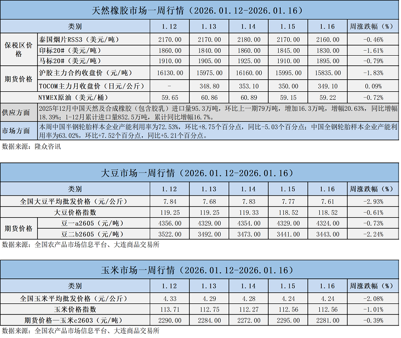 天然橡膠、大豆、玉米市場一周行情(2026.01.12-01.16)