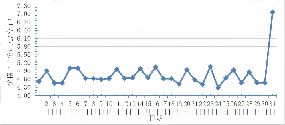 10月,全國重點(diǎn)監(jiān)測農(nóng)產(chǎn)品批發(fā)市場香蕉總交易量達(dá)2.3萬噸,同比基本持平,環(huán)比上漲4.5%;總交易價(jià)值12401.1萬元,同比下降19.2%,環(huán)比下降0.9%。日平均價(jià)格最高為7.0元/千克,最低為4.3元/千克,全月平均價(jià)格為 4.8元/千克,同比下降30.4%,環(huán)比下降4.0%(每日價(jià)格變化如圖)。