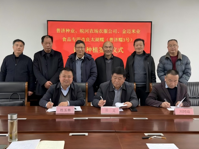 儀式上,三方代表圍繞普濟(jì)糯3號(hào)的品種特性、種植技術(shù)規(guī)范、訂單收購(gòu)價(jià)格、品質(zhì)保障標(biāo)準(zhǔn)等內(nèi)容進(jìn)行深入交流并簽署了1萬(wàn)畝的糯稻訂單協(xié)議。根據(jù)協(xié)議,普濟(jì)種業(yè)將提供優(yōu)質(zhì)種源與技術(shù)指導(dǎo),皖河農(nóng)場(chǎng)公司負(fù)責(zé)組織規(guī)模化種植與生產(chǎn)管理,金邁米業(yè)則按約定價(jià)格兜底收購(gòu),形成糧食生產(chǎn)一體化全產(chǎn)業(yè)鏈閉環(huán)。