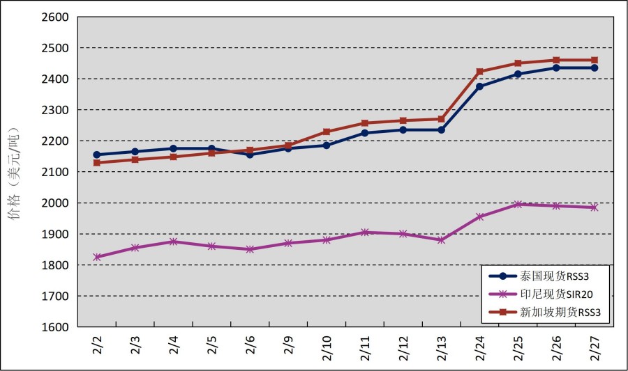 國外主產區(qū):2月,國外主產區(qū)價格呈上漲趨勢。其中,泰國3號煙片膠(RSS3)平均價格2253美元/噸,環(huán)比增加102美元/噸,最高價2435美元/噸,最低價2155美元/噸;印尼20號標準膠(SIR20)平均價格1902美元/噸,環(huán)比增加82美元/噸,最高價1995美元/噸,最低價1825美元/噸。