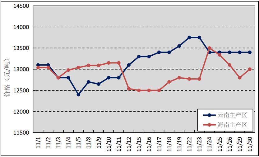 國內(nèi)主產(chǎn)區(qū):11月,我國天然橡膠主產(chǎn)區(qū)逐步向停割期過渡,受寒潮天氣影響,膠水產(chǎn)出有所減少,月底云南產(chǎn)區(qū)已大部分停割。海南原料膠(折干膠)月均價格為12918元/噸,環(huán)比下降295元/噸;云南原料膠(折干膠)月均價格為13168元/噸,環(huán)比上漲465元/噸。