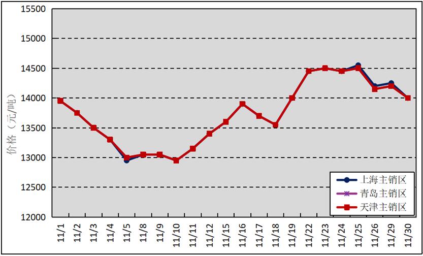 國內(nèi)主銷區(qū):11月,國產(chǎn)全乳標準膠上海市場平均價格13736元/噸,環(huán)比下降230元/噸,最高價為14550元/噸,最低價為12950元/噸;青島市場平均價格13732元/噸,環(huán)比下降234元/噸,最高價為14500元/噸,最低價為12950元/噸;天津市場平均價格13732元/噸,環(huán)比下降234元/噸,最高價為14500元/噸,最低價為12950元/噸。