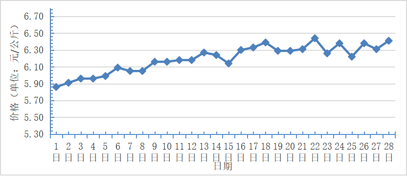 2月,全國香蕉銷售日平均價(jià)格最高為6.4元/千克,最低為5.9元/千克,全月平均價(jià)格為6.2元/千克,同比上漲5.1%,環(huán)比上漲10.7%(每日價(jià)格變化如圖)。