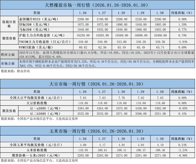 天然橡膠、大豆、玉米市場一周行情(2026.01.26-01.30)