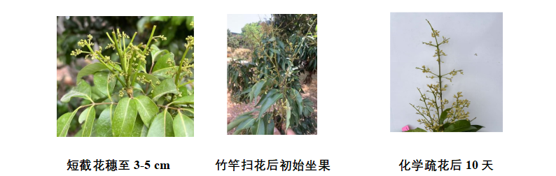 2026年中晚熟荔枝總體呈現(xiàn)中小年成花,但對(duì)于花穗超過(guò)15cm的果樹仍要進(jìn)行疏花,保證營(yíng)養(yǎng)供給。疏花方法分為物理疏花和化學(xué)疏花。物理疏花,以仙進(jìn)奉荔枝為例,選用手持剪刀、電動(dòng)疏花機(jī)疏花,可短截花穗至3~5 cm;選用竹竿掃花,可掃掉4/5的花量。其他品種可參照?qǐng)?zhí)行。這種方法疏花量可控,風(fēng)險(xiǎn)低,但勞動(dòng)量大?;瘜W(xué)疏花,可選用 40%乙烯利5000倍液和15%多效唑800倍液混合噴施,或 6%乙氧氟草醚10000倍液和 15%多效唑800倍液混合噴施荔枝花穗。這種方法效率高,但技術(shù)門檻較高,要在當(dāng)?shù)剞r(nóng)技人員或技術(shù)專家的指導(dǎo)下,嚴(yán)格把握用藥濃度和藥量,建議使用前選擇少量樹體進(jìn)行試驗(yàn),確定無(wú)藥害后再大面積施用。若遇溫度高、光照強(qiáng)時(shí)要適當(dāng)降低濃度,噴濕即可,不可反復(fù)噴施。