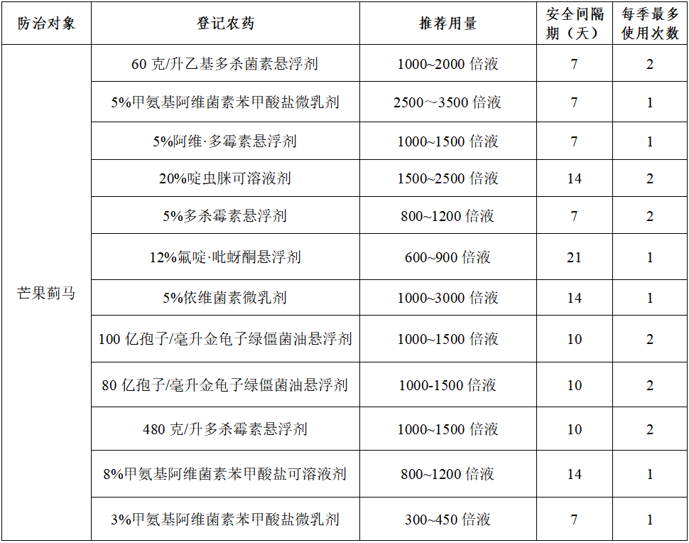 表 防治芒果薊馬可供選用的登記農(nóng)藥產(chǎn)品相關信息