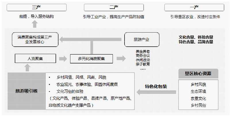 農(nóng)墾系統(tǒng)的“321”全產(chǎn)業(yè)鏈發(fā)展模式,強(qiáng)調(diào)三產(chǎn)之間的互動效率和產(chǎn)業(yè)能力提升。這一模式以墾區(qū)核心資源的分析挖掘為起點,通過對資源的特色化、產(chǎn)品化包裝形成旅游產(chǎn)業(yè)的吸引核,以聚集人氣,形成旅游引導(dǎo)的消費(fèi)聚集,并引致消費(fèi)產(chǎn)業(yè)的就業(yè)供給側(cè)聚集,形成以旅游產(chǎn)業(yè)為核心的三產(chǎn)服務(wù)結(jié)構(gòu),進(jìn)而引導(dǎo)加工產(chǎn)業(yè)發(fā)展,帶動墾區(qū)農(nóng)業(yè)發(fā)展方式轉(zhuǎn)型升級。